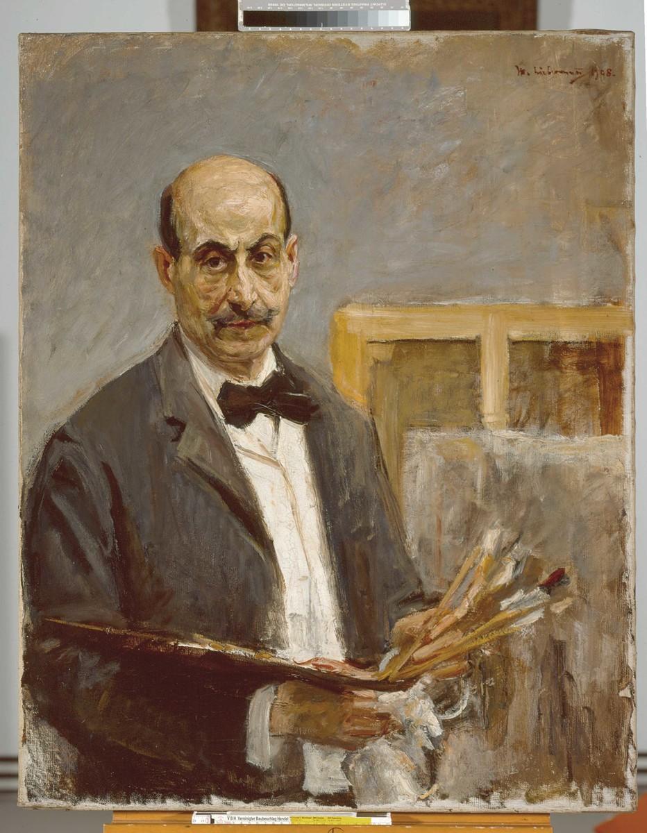 Max Liebermann, Autoportrait aux pinceaux et à la palette, 1908, huile sur toile, 97 x 77 cm, Saarbrücken, Saarlandmuseum, Moderne Galerie. Source : Bildarchiv Saarlandmuseum / Maaß, Raphael, CC BY-NC-ND-4.0.