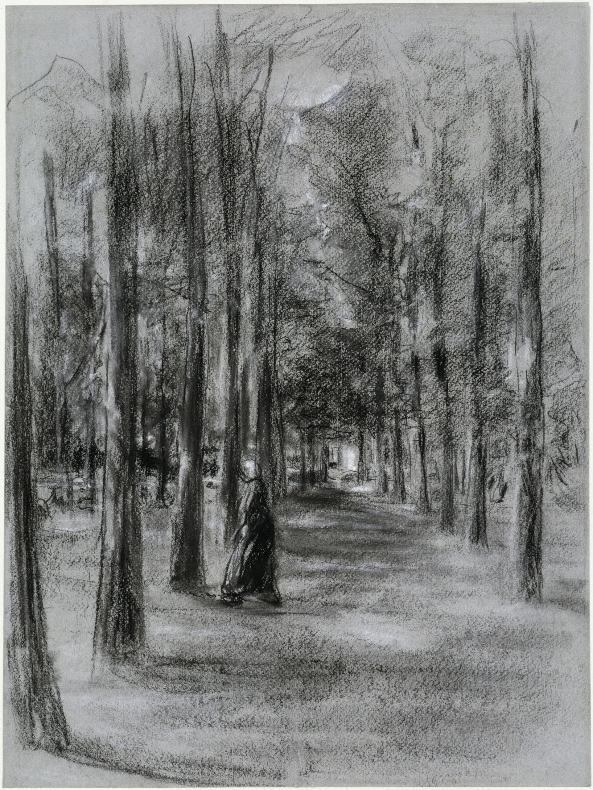 Max Liebermann, Allée à Laren (Hollande), 1896, craie noire, rehauts de blanc sur papier gris, 35,8 x 26,9 cm; Berlin, Kupferstichkabinett. Source : Staatliche Museen zu Berlin, Kupferstichkabinett / Jörg P. Anders Public Domain Mark 1.0.