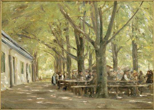 Max Liebermann, Biergarten à Munich, 1884, huile sur bois, 95 x 68,5 cm, Munich, Bayerische Staatsgemäldesammlungen - Neue Pinakothek. Source : Bayerische Staatsgemäldesammlungen CC BY-SA 4.0.