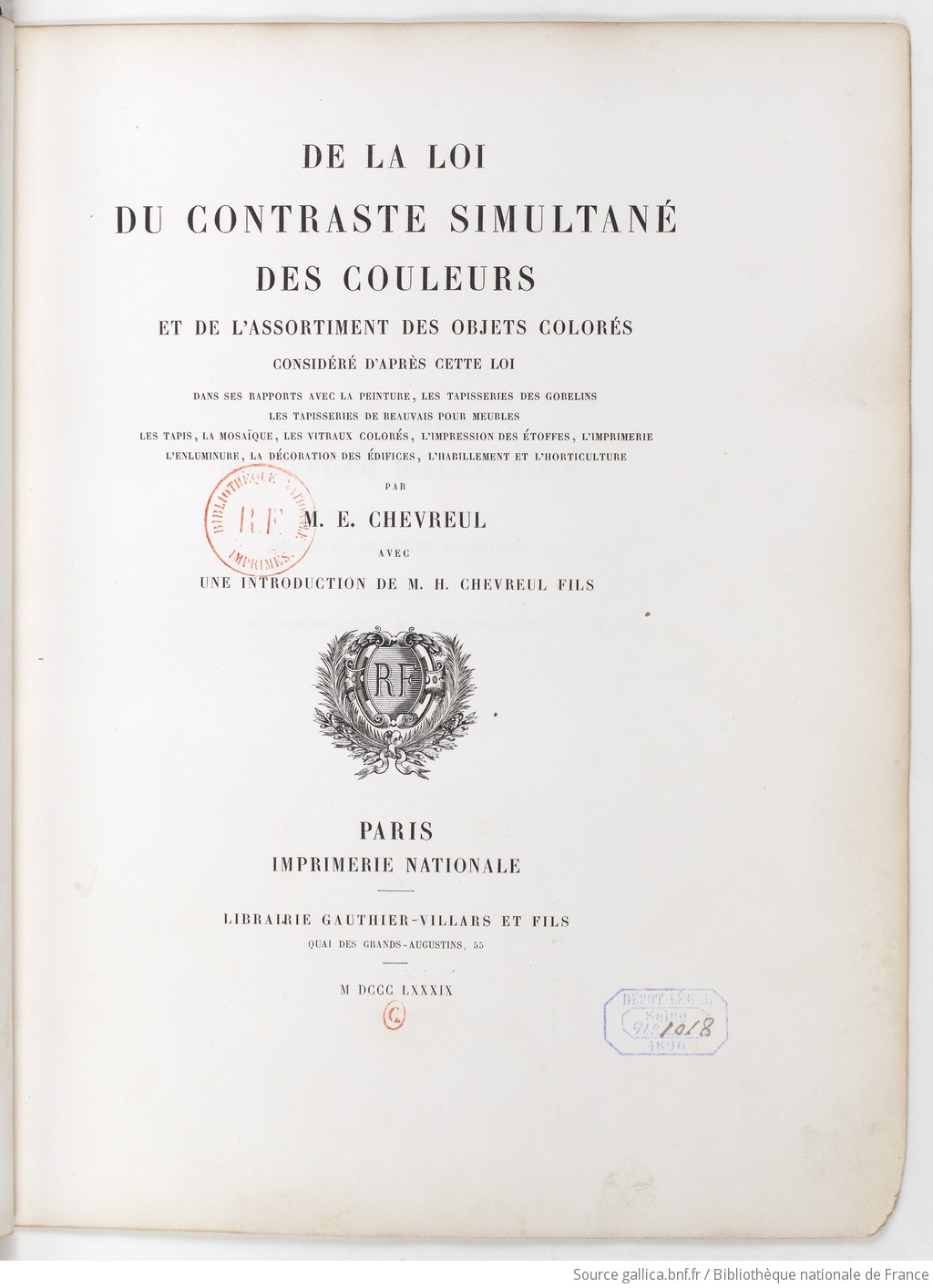 Eugène Chevreul, De la loi du contraste simultané des couleurs et de l'assortiment des objets colorés, considérés d'après cette loi dans ses rapports avec la peinture, les tapisseries..., Paris, Gauthier-Villars et fils, 1889.
