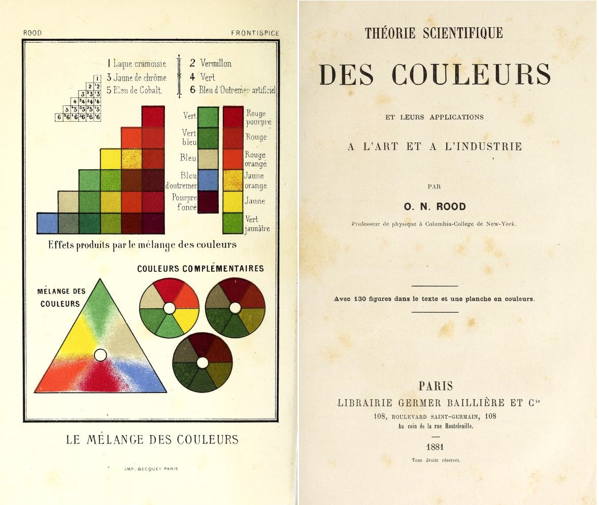 Ogden Nicholas Rood,Théorie scientifique des couleurs : et leurs applications a l'art et a l'industrie, Paris, Germer Baillière et Cie, 1881.