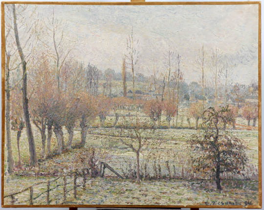 Grâce à un prêt de Monet, Julie et Camille Pissarro achètent leur maison en 1892, et Camille transforme la grange de leur propriété en atelier. Cela permet à l’artiste, souffrant désormais d’une infection oculaire chronique qui l’empêche de peindre à l’extérieur, de pouvoir créer depuis son atelier. Les fenêtres de l’atelier encadrent les alentours que Pissarro peint inlassablement. Si le cadre des fenêtres n’est jamais visible dans ces œuvres, le point de vue élevé porté sur la nature environnante transforme les compositions du maître. Dans ces paysages ruraux, Pissarro étudie les effets des saisons, de la météo et de l’heure de la journée de manière beaucoup plus approfondie qu’il ne l’avait fait auparavant. On y voit la campagne baignée de soleil, enveloppée de brouillard, ou recouverte de givre ou de neige, comme dans ses vues de Bazincourt, commune voisine d’Éragny, développées depuis la fenêtre de son atelier.