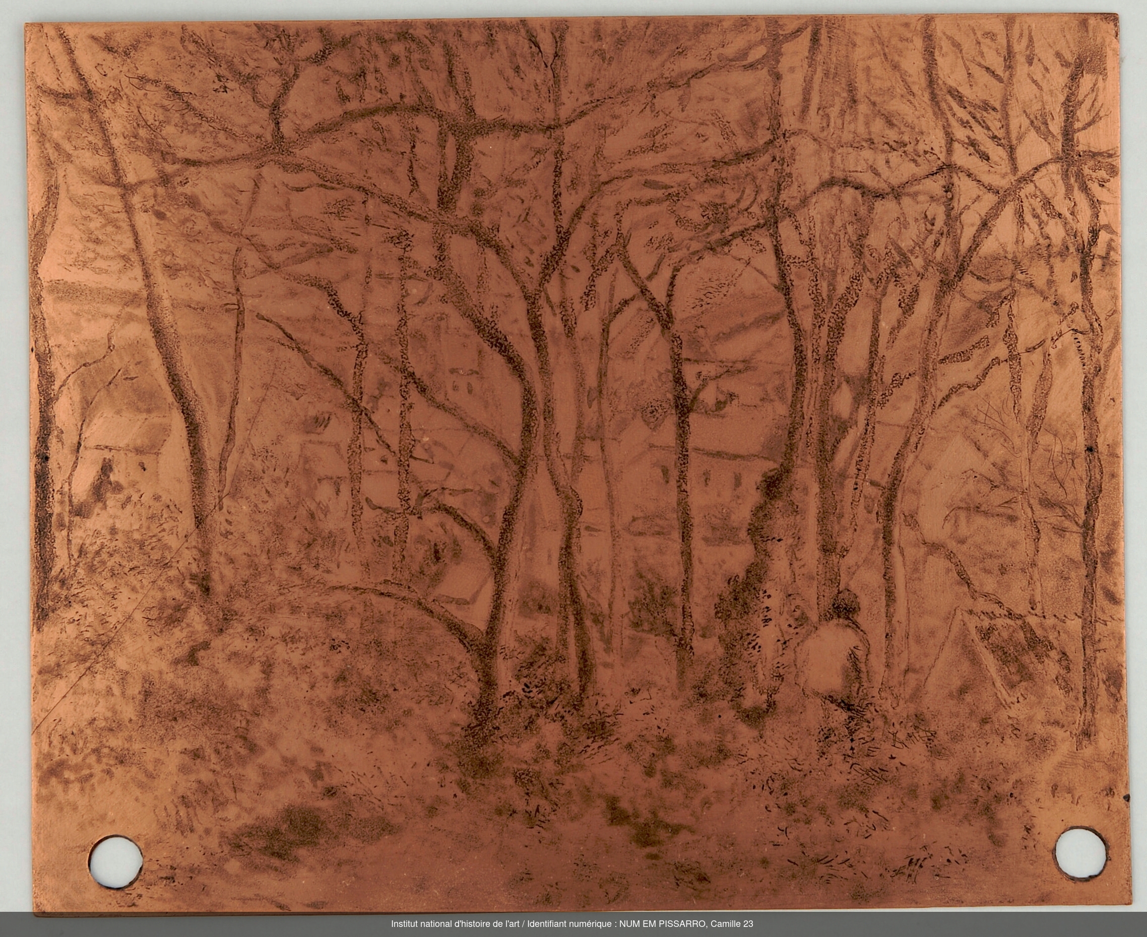 Camille Pissarro, Paysage sous bois à l’Hermitage Pontoise, 1879, plaque de cuivre gravée à l’eau-forte et aquatinte, annulée par deux trous, 22,2 x 27,1 cm, Paris, INHA, collections Jacques Doucet. Source : INHA, Licence ouverte Etalab.