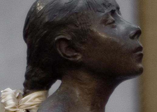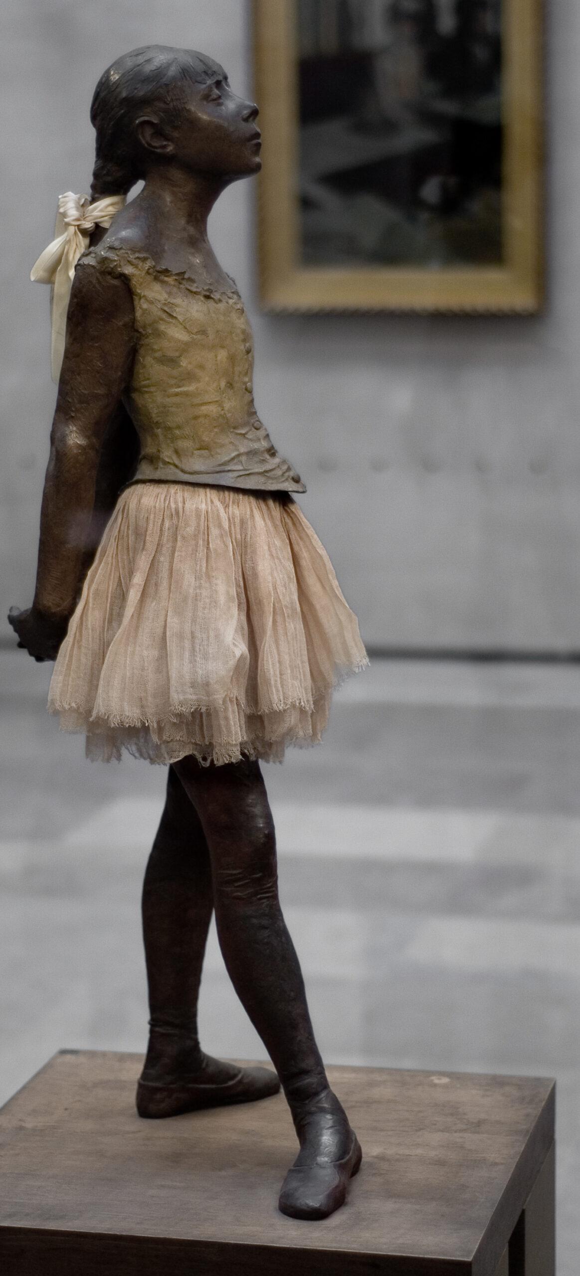 Edgar Degas, Petite danseuse de quatorze ans , entre 1921 et 1931, statue en bronze patiné, tutu en tulle, ruban de satin, socle en bois, 103,8 x 48,8 x 50 cm, Paris, musée d'Orsay. Source : Wikimedia / Filip42, CC BY.