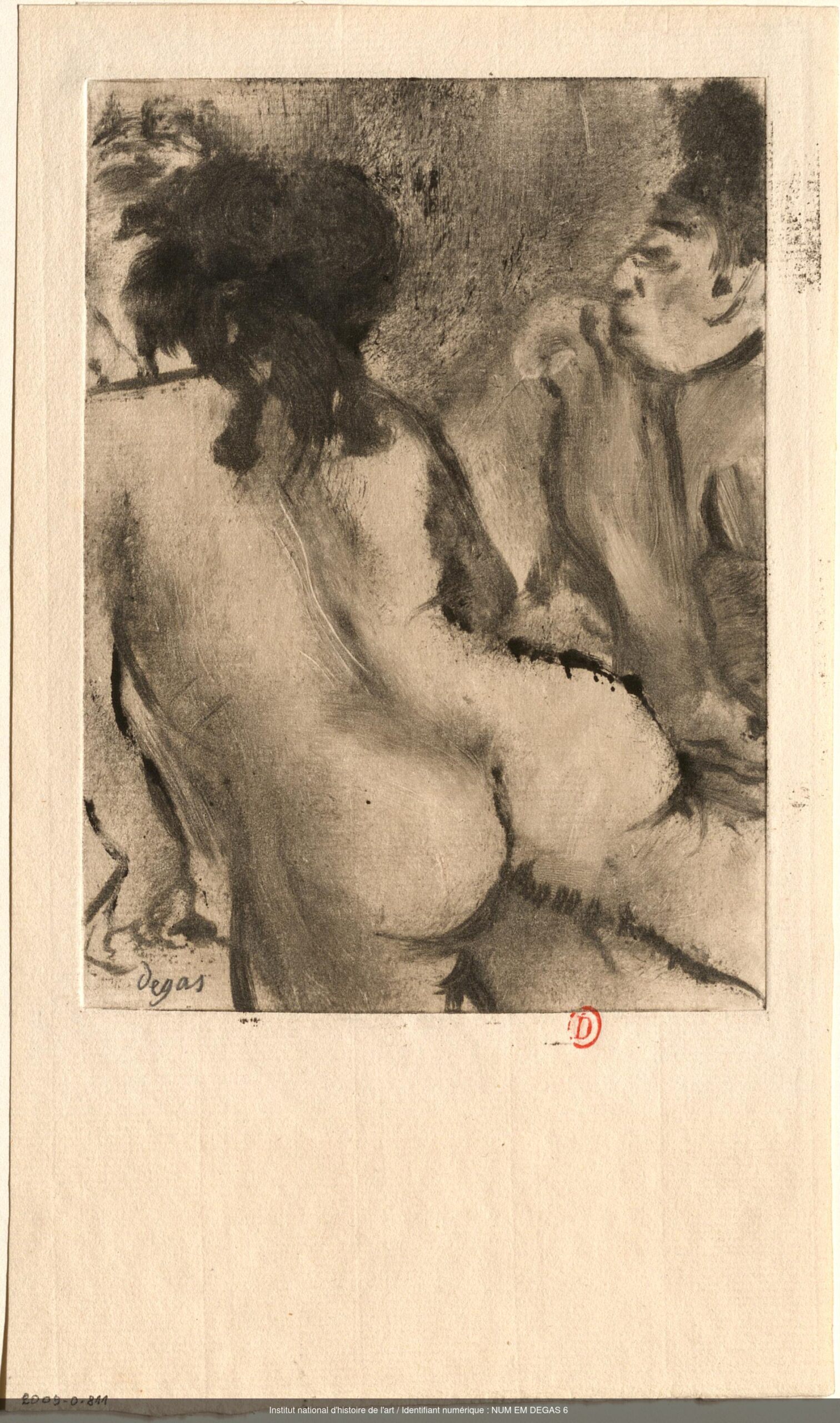 Edgar Degas, L'entremetteuse, vers 1880, monotype à l'encre noire, 16,1 x 11,8 cm (image) ; 24,2 x 14,3 cm (feuille), Paris, bibliothèque de l’INHA, collections Jacques Doucet. Source : Inha licence ouverte Etalab.